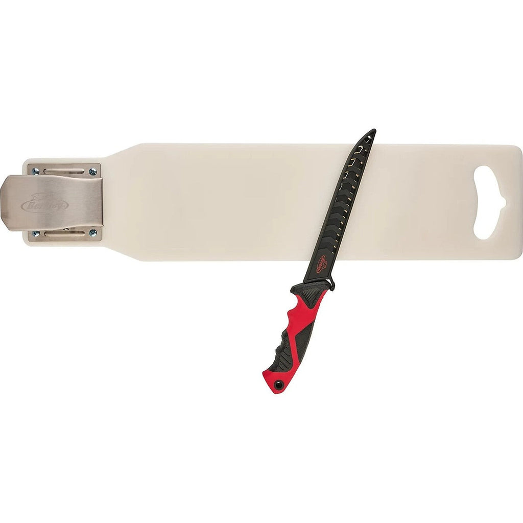 - Stainless steel fillet knife has a thumb release and a protective sheath