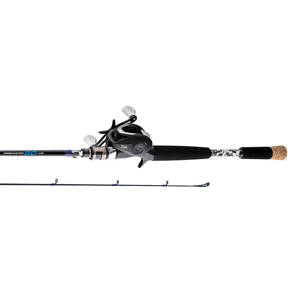 Daiwa's 80's series reel matched up with a graphite composite rod makes a day on the water a pure pleasure. Whether you are a seasoned angler or just learning the bait casting technique, the Procaster will perform for you. The low profile reel is stuffed with bearings and a sturdy drag to handle the biggest of fights. The graphite rods are sensitive and tough with Daiwa's signature black and white digital camo highlights.