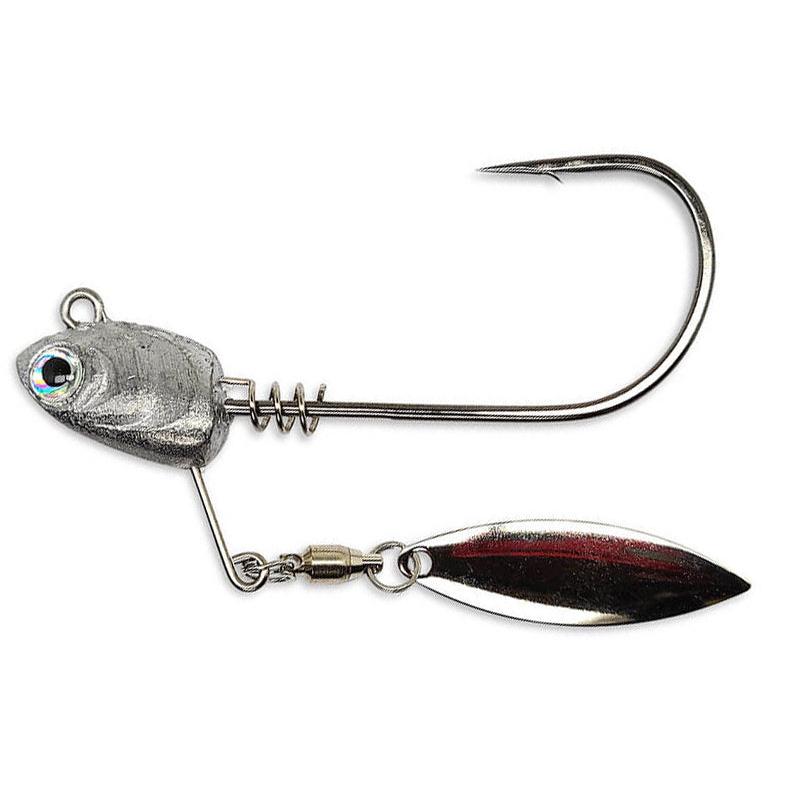 The Under Spin Head features Gamakatsu Heavy Cover 60-degree hook. The heavy wire and wide gap design of the Heavy Cover gives anglers a better hook up ratio and retention when using bulky swim baits. Ideal for heavy braid or fluorocarbon line. The head profile is streamlined to glide through cover. Gamakatsu Spring Lock holds swim baits and other plastics gently but firmly, keeping your presentation straight on the hook. Recessed lifelike eyes on the Under Spin provide a focal point for predators. The small chrome blade is attached to a quality ball-bearing swivel allowing it to spin freely, even at the slowest retrieves, to simulate baitfish and create a subtle trigger.