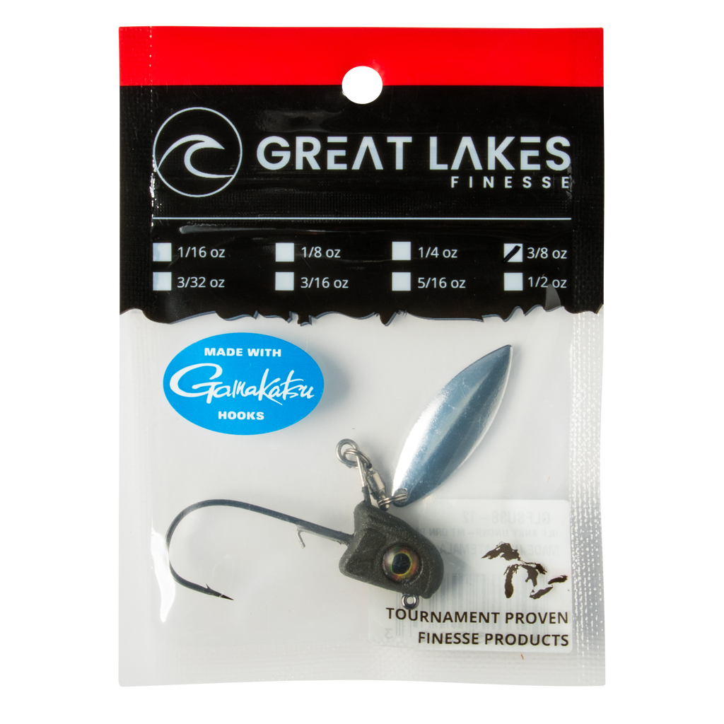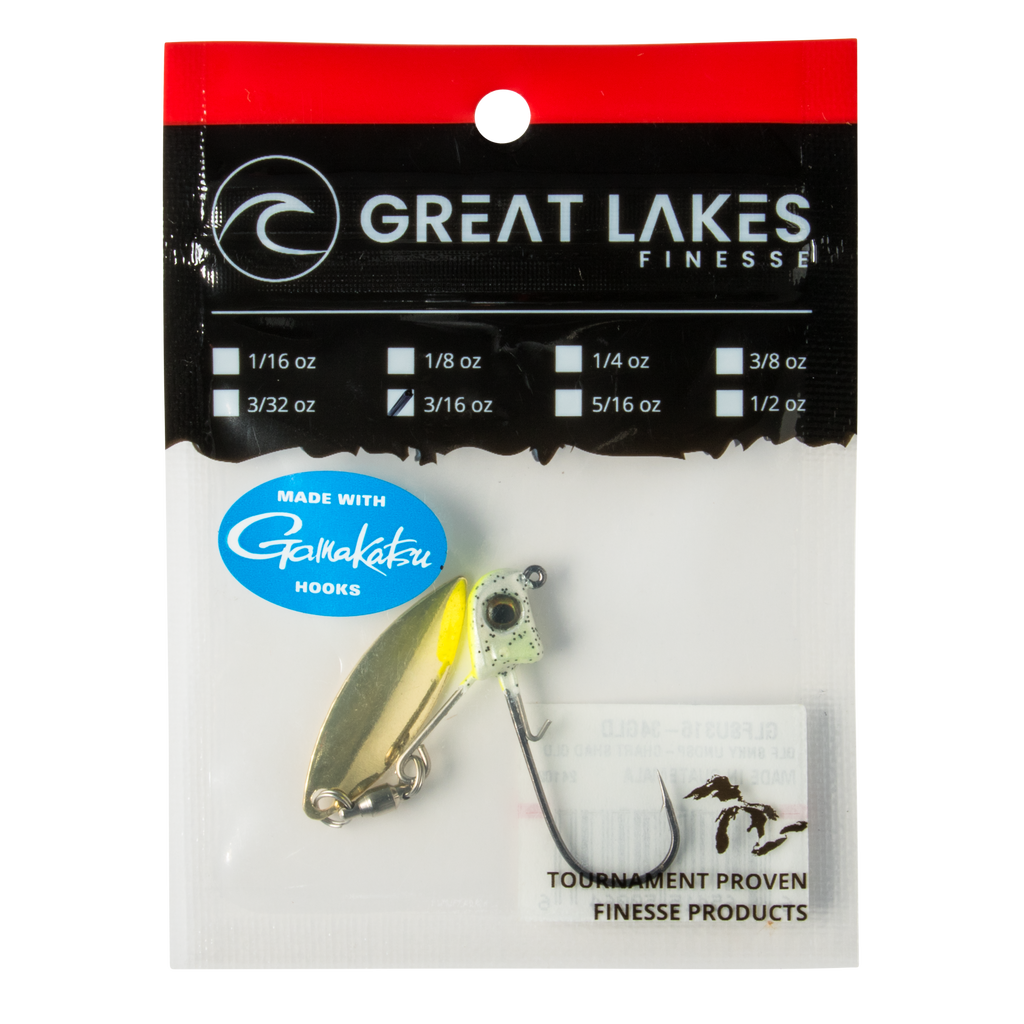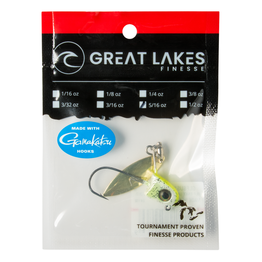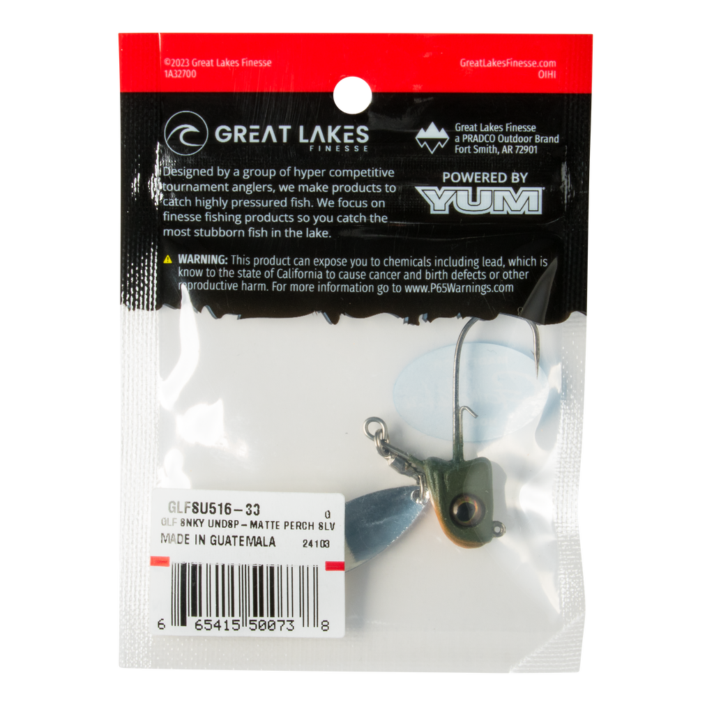 The Sneaky Underspin is everything premium youve come to expect from Great Lakes Finesse Also known as the Lake Vacuum to us because it catches everything this underspin has been thought out from endtoend to perform to the high standards of the most hardcore anglersStainless steel components and a ball bearing swivel will have the blade spinning at the slowest retrieve speed Featuring a 10 Owner hook and wire bait keeper its designed to match finesse swimbaits and our 275 Drop Minnow perfectly Our custom head design lifelike 3D eyes and forward line tie placement allow it to swim perfectly horizontal and through sparse vegetation with no hangups The 316oz is perfect for shallow slow rolling presentations while the 516oz is perfect for burning it shallow or getting deep with a finesse bait