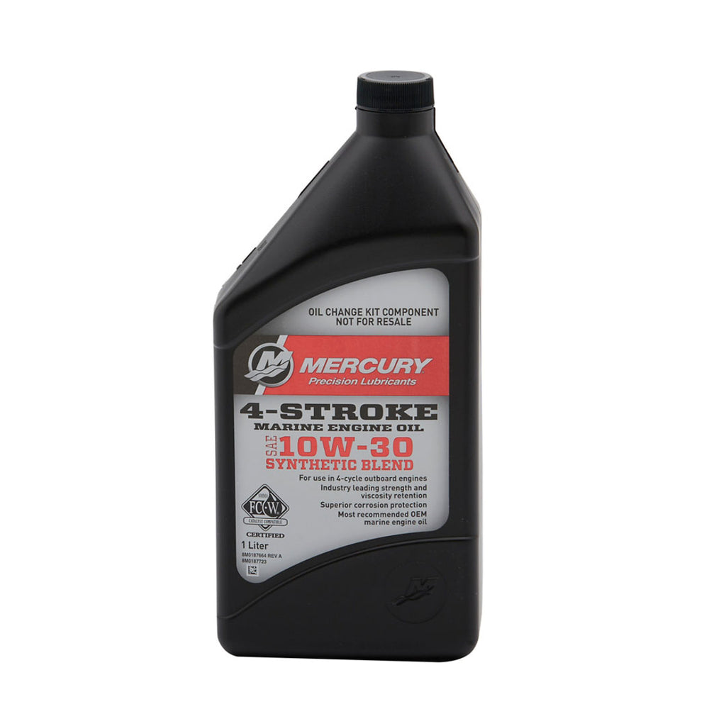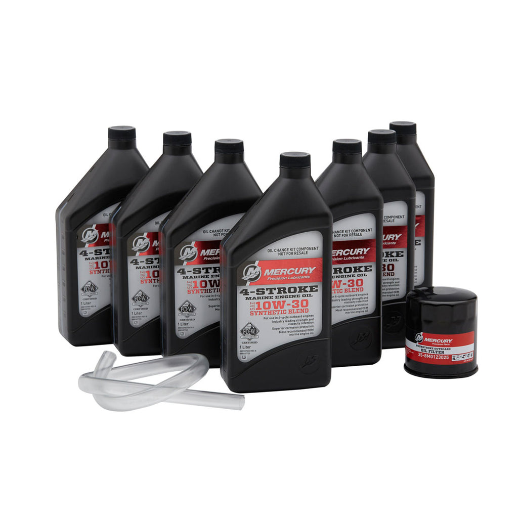 - Complete oil change kit includes seven 1-liter bottles of Mercury 10W-30 4-Stroke Marine Engine Oil, oil filter, drain hose and instructions