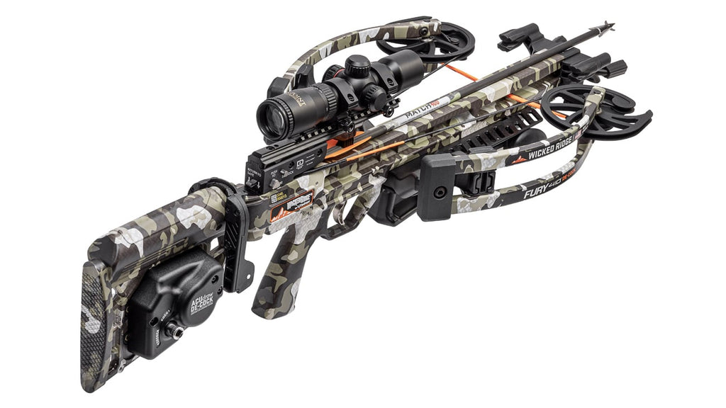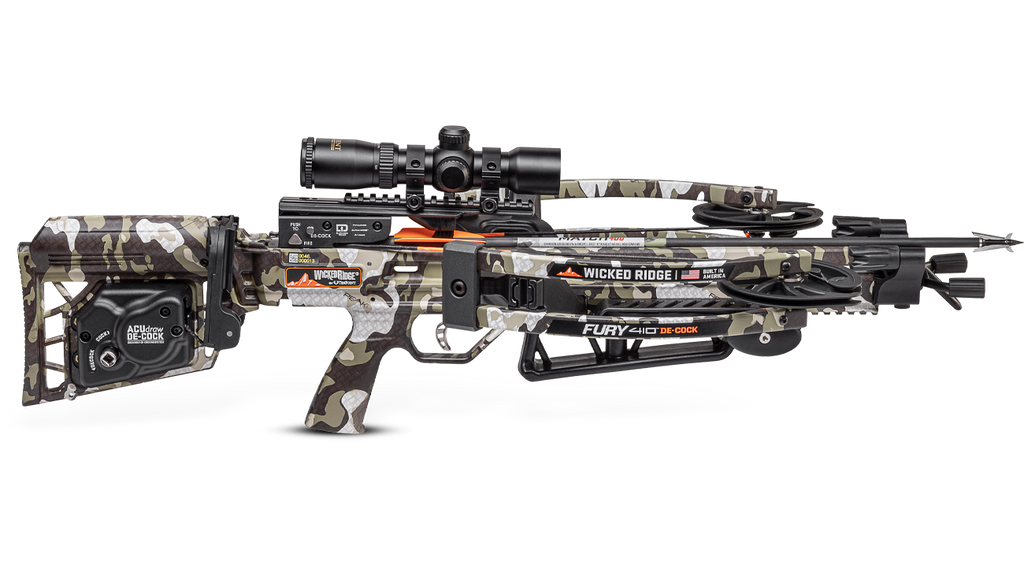 Equipped with the revolutionary ACUdraw De-Cock for safe de-cocking, D1 Trigger, and a reverse-draw crossbow design with undeniable speed and power advantages, the American-Built Fury 410 De-Cock shoots 410 FPS and is a super short crossbow at 29-inches long and delivers performance you’ve never seen before at its price-point.